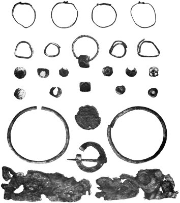 Золотые височные кольца, подвеска, сердоликовые, пастовые и серебряные ажурные бусы, пара браслетов, золотые перстни, серебряная пряжка, диргем, фрагменты ткани. Обнаружены в погребении IX–X вв. знатной женщины. Раскопки 1937 г. в усадьбе Художественной школы. Киев