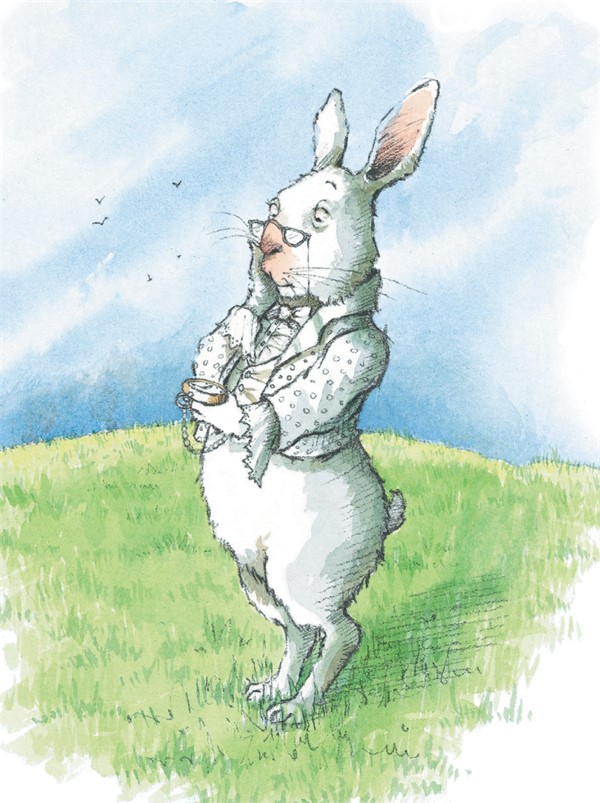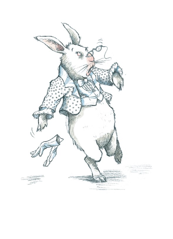 Вдруг издалека раздался едва слышный топоток, причём с каждой минутой он становился всё отчётливее. Алиса торопливо вытерла глаза – надо же посмотреть, кто это там. Оказалось, что это Белый Кролик. Разодетый, с парой белых лайковых перчаток в одной лапе и с большим веером в другой, он очень торопился и на ходу бормотал себе под нос: