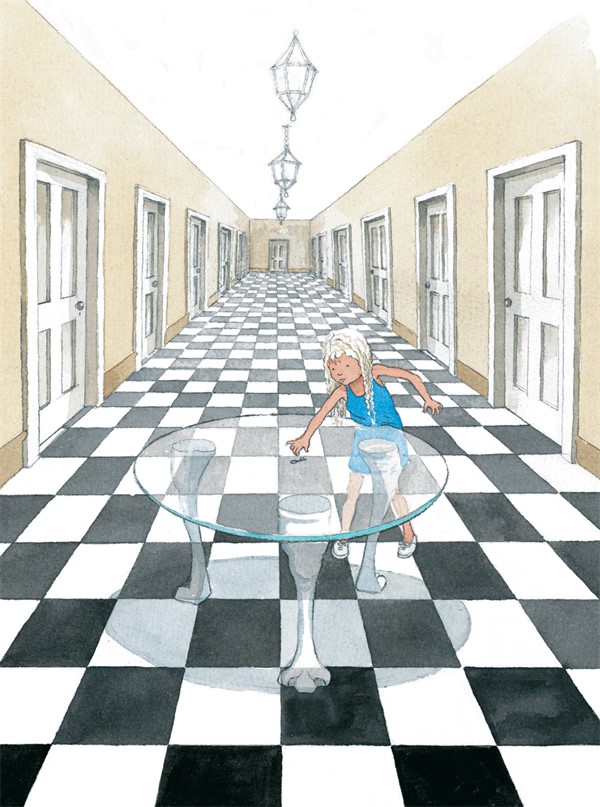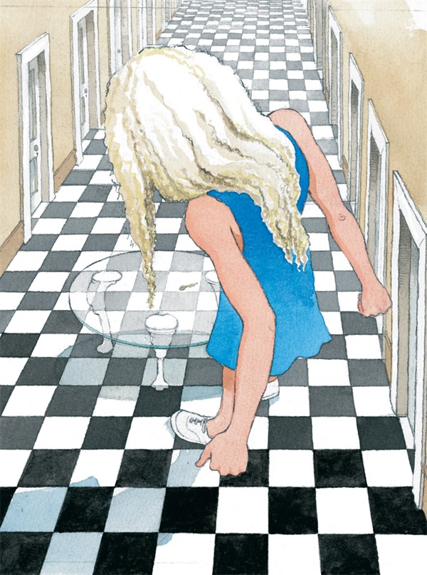 В зале было множество дверей, но все они были заперты – Алиса убедилась в этом, подёргав каждую. Огорчённая, она бродила по залу, раздумывая, как же ей выбраться отсюда, и вдруг увидела в центре зала столик из толстого стекла, а на нём золотой ключик. Алиса обрадовалась, решив, что это ключ от одной из дверей. Увы, ключ не подошёл ни к одной: одни замочные скважины были слишком большими, другие – слишком маленькими.