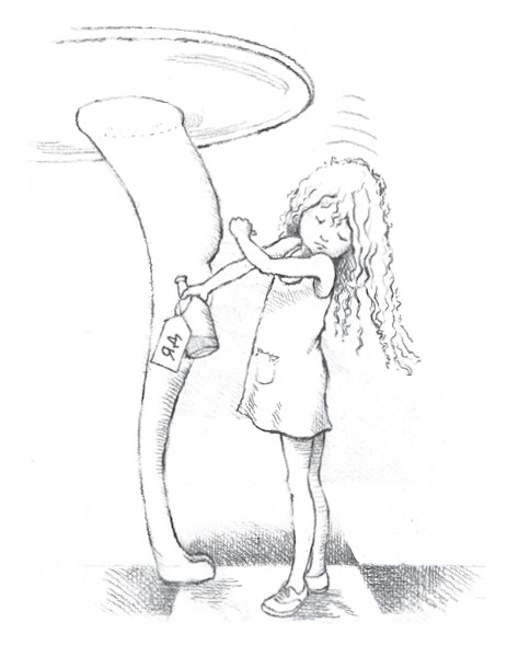 Горестно вздохнув, Алиса опустила глаза и с удивлением обнаружила, что сама не заметила, как надела на руку крошечную перчатку Кролика. «Должно быть, я опять стала маленькой», – подумала она и бросилась к столу, чтобы выяснить, какого же теперь она роста.