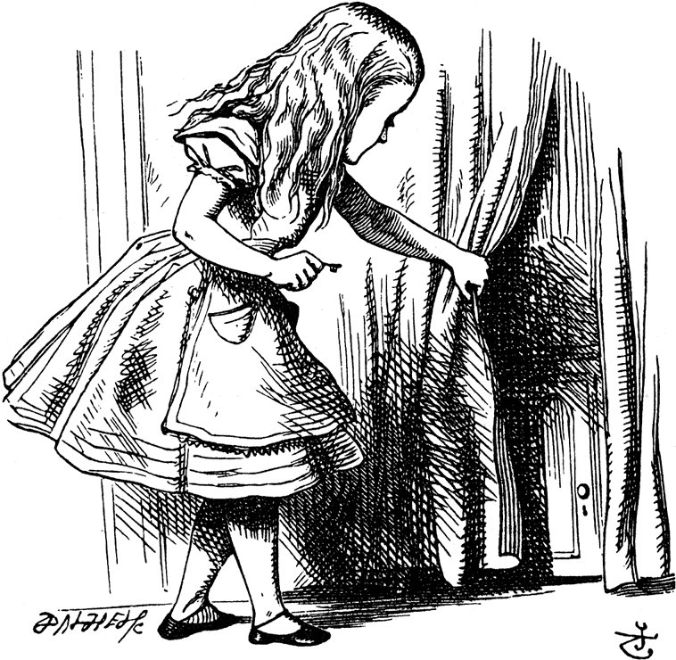 Alice opened the door and found that it led into a small passage, not much larger than a rat-hole: she knelt down and looked along the passage into the loveliest garden you ever saw. How she longed to get out of that dark hall, and wander about among those beds of bright flowers and those cool fountains, but she could not even get her head through the doorway; ‘and even if my head would go through,’ thought poor Alice, ‘it would be of very little use without my shoulders. Oh, how I wish I could shut up like a telescope! I think I could, if I only knew how to begin.’ For, you see, so many out-of-the-way things had happened lately, that Alice had begun to think that very few things indeed were really impossible.