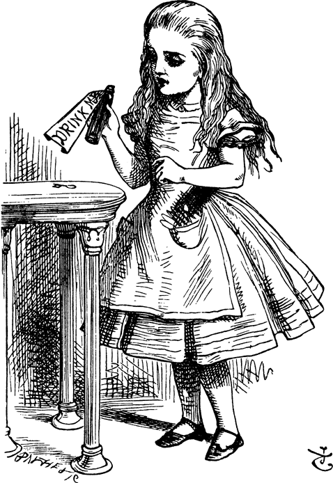 It was all very well to say ‘Drink me,’ but the wise little Alice was not going to do that in a hurry. ‘No, I’ll look first,’ she said, ‘and see whether it’s marked “poison” or not;’ for she had read several nice little histories about children who had got burnt, and eaten up by wild beasts and other unpleasant things, all because they would not remember the simple rules their friends had taught them: such as, that a red-hot poker will burn you if you hold it too long; and that if you cut your finger very deeply with a knife, it usually bleeds; and she had never forgotten that, if you drink much from a bottle marked ‘poison,’ it is almost certain to disagree with you, sooner or later.