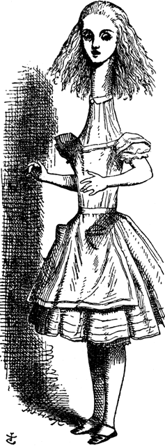 Soon her eye fell on a little glass box that was lying under the table: she opened it, and found in it a very small cake, on which the words ‘EAT ME’ were beautifully marked in currants. ‘Well, I’ll eat it,’ said Alice, ‘and if it makes me grow larger, I can reach the key; and if it makes me grow smaller, I can creep under the door; so either way I’ll get into the garden, and I don’t care which happens!’