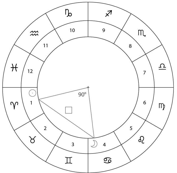 Если говорить точнее, аспект – это геометрический угол, под которым небесные тела расположены друг к другу. На рисунке выше Солнце и Луна расположены под углом 90° друг к другу; считается, что они образуют квадрат.