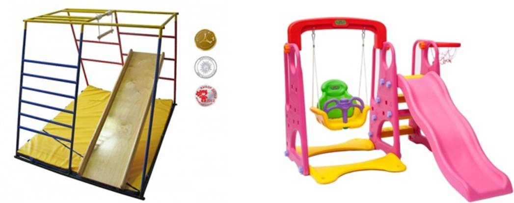 Спортивное оборудование. Качели, горка, лесенка, коврики с разной поверхностью.