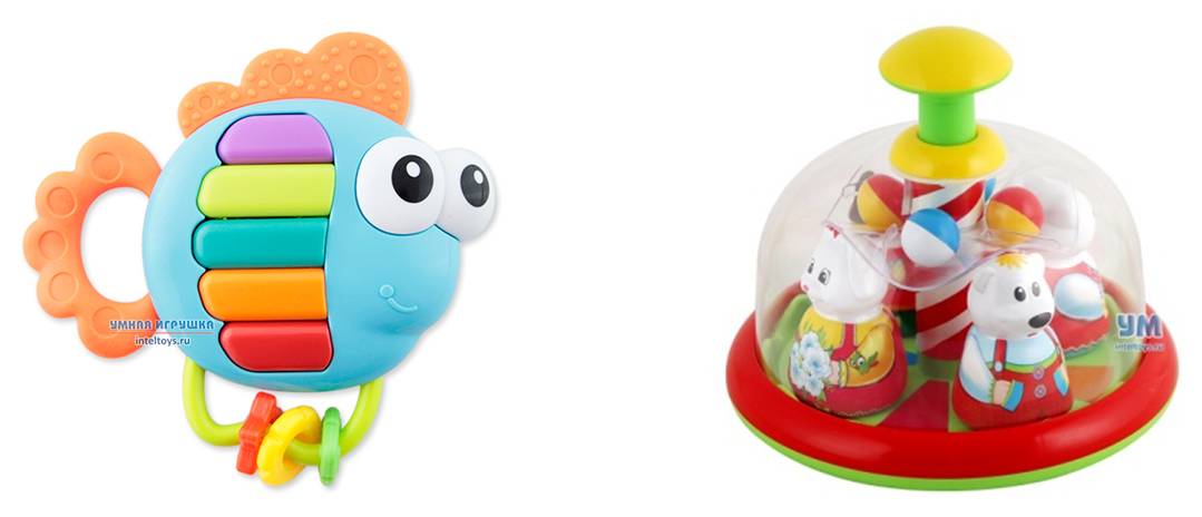 Интерактивные игрушки с кнопками, клавишами, рычажками. Конечно, это не самая необходимая игрушка при условии, что вы много внимания уделяете развитию мелкой моторики малыша – играете с крупами и водой, регулярно делаете пальчиковую гимнастику и т.д. Но малыши любят эти игрушки, поэтому никакого вреда от 2-3-х игрушек с кнопками не будет. Только не надо пытаться купить игрушку, как я их называю «100 в 1», которые обучают и голосам животных, и алфавиту, и цифрам, и цветам, и формам, и как говорить «Привет» на 5 языках и т.п. Пусть это лучше будут 1-2 функции, но соответствующие возрасту ребенка, тогда игрушка будет для него действительно интересной и полезной. Кстати, к этой же категории относится игрушка с безупречной репутацией – юла.