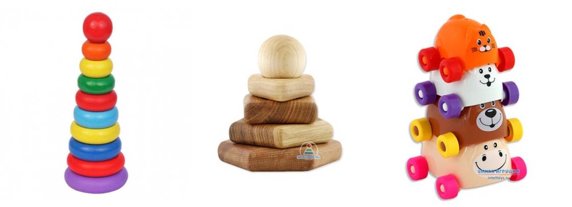 Пирамидка. Лучше купить крупную пластиковую с количеством колец 3-5 шт. Сначала ребенок учится снимать колечки. Это хорошо тренирует кисти рук, координацию движений, глазомер. Следующее достижение – научиться надевать кольцо, сначала самое большое. Забегая вперед, скажу – после года малыш будет учиться правильно собирать пирамидку, будет выбирать колечки по размеру, проверять правильность сборки, проводя ручкой сверху в низ. А сейчас уже можно проговаривать цвета и размеры, показывая колечки. затем – надевать в произвольном порядке.