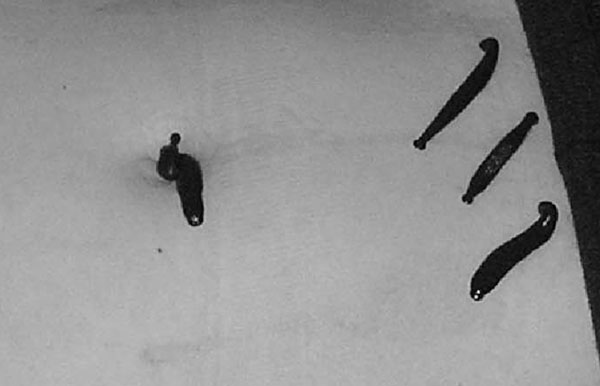 Если какая-то не хочет садиться, придется поменять ее – это живые существа, и вполне возможно, что им может не нравиться запах кожи и пота, они не чувствуют сегодня желания есть эту еду – найдем более «сговорчивую», а ту посадим в другой раз. Я всегда грею перед постановкой место укуса 5–10 секунд – пока сажаю пиявки в шприц, на коже пациента в нужном месте лежит отжатый ватный диск, смоченный в горячей воде. Пиявка любит теплое и меньше капризничает. У меня в «арсенале» несколько подготовленных шприцев разного диаметра – для разных мест. Пиявки не любят очень тесного пространства, но иногда надо поставить более точно. Стараемся поставить в пупок прямо в серединку, но не расстраиваемся и не снимаем пиявочку, если она встала немного сбоку в пупочке – там вся зона рабочая. Больше часа держать не стоит – все, что могла, она для вас сделала – всю слюну впрыснула, теперь эта слюна будет работать, и на следующий раз в эту зону другие пиявки встанут более охотно, быстрее наедятся и продолжат начатое сегодня. За один раз не почистить то, что копилось годами. Будем терпеливы. Через 45–60 минут можно снять пиявку. В место укуса вставляем свернутый в трубочку ватный диск, а сверху еще два-три диска или кусочек прокладки.