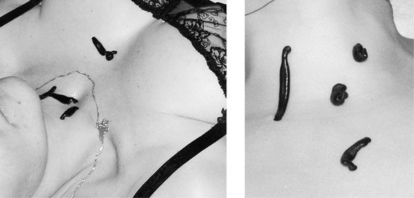 Если пиявка поела хоть наполовину – ее легко снять, погладив сухим ватным диском по мордочке. Если совсем маленькая, придется намочить диск в водке или спирте и поднести к ее носику – она тут же плюнет и примется бежать. Не надо обжигать спиртом ее мордочку – эффект и так всегда есть. Все, пиявку в отдельную банку, а на укус положить кусочек прокладки и наклеить липкий бинт. Он так и называется: «Бинт-Ли». Берите в аптеке отечественный – он в три раза дешевле импортного, но нисколько не хуже. Обычными пластырями я не пользуюсь, они травмируют кожу. Если ваш пациент мужчина и вокруг пупка волосы – прибинтуйте прокладку эластичным бинтом, только не затягивайте туго, не мешайте процессу истечения крови. Если волос нет – фиксируйте «Бинт-Ли». Через 4–6 часов проверьте место укуса – если кровь перестала течь, промойте его чистой водой и смажьте любым противоаллергическим кремом, чтобы не чесалось. Подойдут «Гистан», «Боро-плюс», «Звездочка» и другие. Если не перестала – смените прокладку и ложитесь спать. Хоть и говорят, что теоретически кровь может подтекать до двух суток, на практике я такого за 10 лет не видела ни разу. Лишь дважды кровь текла около суток, а обычно уже через 4–8 часов все прекращается. Если идет 12 часов – прекрасно. Это лучше, чем два. Значит, кровь не такая уж вязкая, ответ на слюну пиявки хороший, меньше скопится грязи около укуса и не будет чесаться, больше заменится крови – чище станет общий кровоток. Так что не пользуемся никакими медицинскими клеями и перекисями водорода – пусть процесс продолжается как можно дольше.