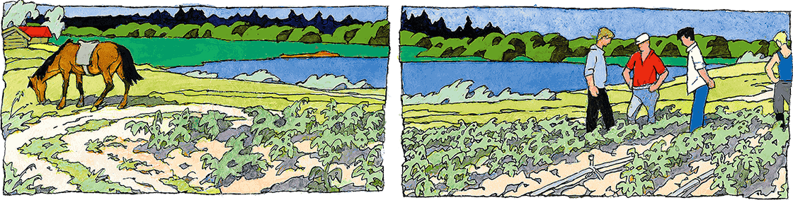 Отец подошёл к председателю, и они все вместе: и отец, и председатель, и бригадиры, и механик из МТС – пошли куда-то по бороздам. Далеко ушли, к самому озеру. А озеро блестело вдали серебряной полосой – то самое озеро, к которому на заре приходил лось.