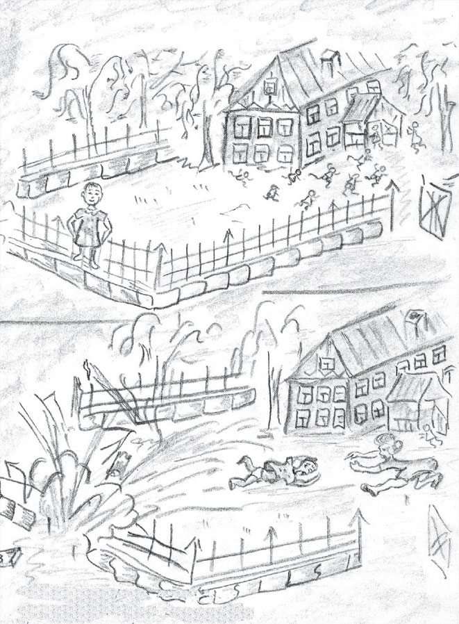 Однажды случилось страшное. Неожиданно началась стрельба, на которую мы не обратили особого внимания. А в небе с ревом появились самолеты. Мы, задрав головы, глядели на них и, показывая пальцами, прыгали и визжали от восторга. А день был жаркий, солнечный, и небо чистое-чистое, голубое-голубое. И самолеты! Мы, наверное, тогда так и не поняли – наши или нет. И не знали мы, что это был наш последний восторг, а до трагедии оставались секунды…