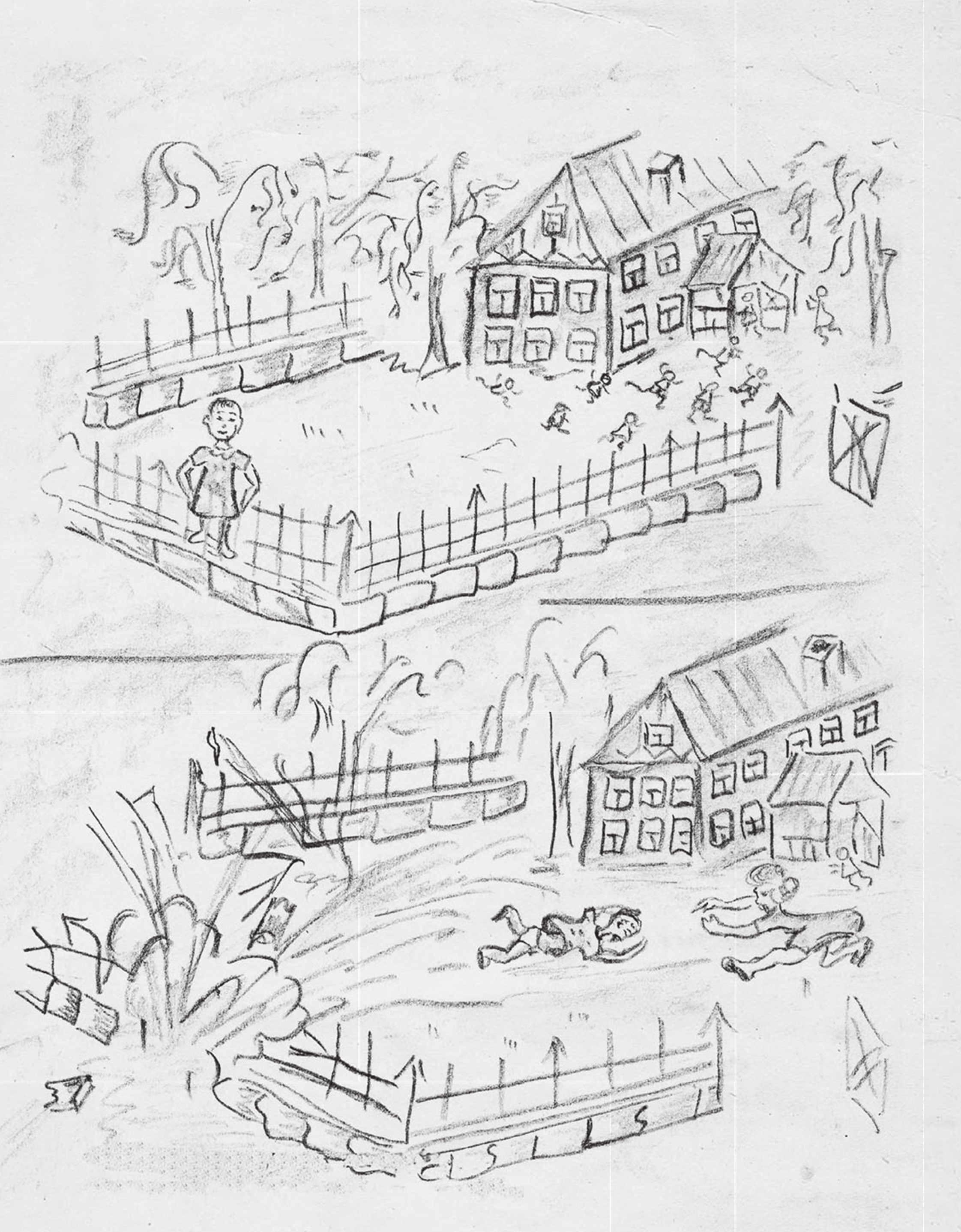 На участке нашей дачи совсем незнакомые люди роют окопы. Мы не знали, что это такое и зачем, и дружно решаем, что это нам делают для игры, и мы очень радуемся. Когда люди уходят, мы бегаем по этим извилистым лабиринтам. Там можно прятаться. Мы уверены, что там сделают деревянный пол, стены поклеют обоями или покрасят, а чтобы нас не мочил дождь, сделают крышу. А пока нас ругают, потому что мы там очень пачкаемся. Но окопы продолжают рыть, а мы продолжаем там играть.