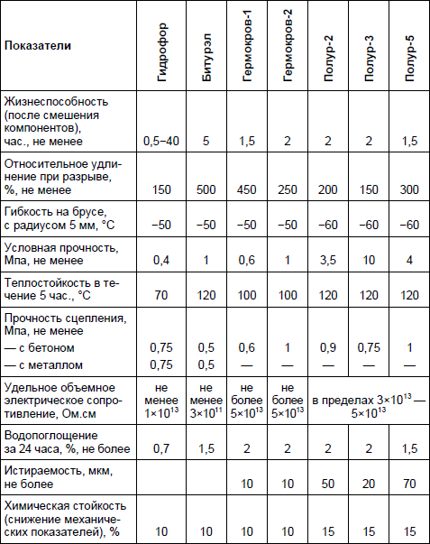 Основные технические характеристики мастик и покрытия «Гидрофор», «Битурэл», «Гермокров», «Полур» приведены в табл. 2.1.