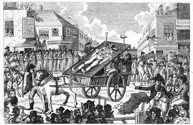 Была устроена впечатляющая демонстрация мертвого тела Уильямса жителям Уоппинга. В канун Нового года состоялось погребение. Огромная толпа, насчитывавшая, как говорили, 180 тысяч, выстроилась вдоль Рэтклиффской дороги, чтобы увидеть, как проедет повозка с телом. Гравюры тех лет запечатлели картину – труп в двуколке, выставленный на всеобщее обозрение, стража по бокам, вооруженная дубинками, и море голов – людей, толпящихся на тротуарах, приникших к оконным стеклам. Рядом с телом Уильямса были выставлены и орудия преступления – лом, стамеска и инструмент, который корабельные плотники именуют молотом.