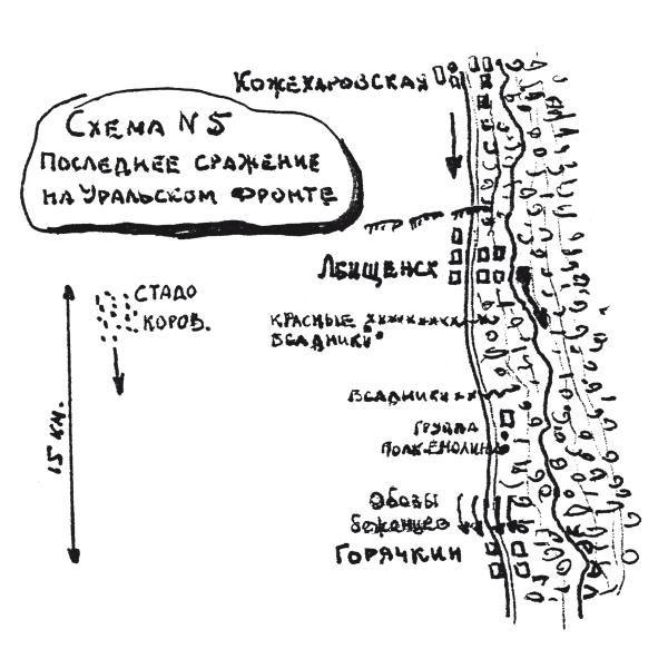 К моменту моего возвращения в штаб корпуса в Лбищенске красные занимали Бударин. Расположение частей корпуса в это время приблизительно было следующим: передовые части пехоты полковника Емелина находились 4–5 вёрст южнее Бударина. Гурьевский и Уральский пехотные полки, 1-й Партизанский Конный полк 2-й Уральской дивизии и первая батарея есаула Юдина – в Лбищенске. Конный отряд полковника Кириллова, по слухам, находился где-то в районе Чулан-Анкоты, 100 вёрст северо-восточнее Лбищенска. Полки 6-ой дивизии, спасаясь от бескормицы, ушли по направлению Сламихинской станицы. О местонахождении 2-ой дивизии сведений не было.