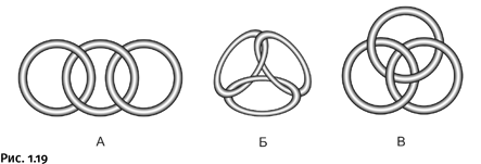 На сегодня известны и популярны несколько версий сплетенных колец: два кольца как символ бракосочетания, четыре кольца – эмблема автомобильной фирмы Audi и пять колец – эмблема Олимпийских игр. Тем не менее существует еще один символ, известный в течение нескольких столетий, но почти забытый в наши дни. Речь идет о трех кольцах, сплетенных особым образом. Рассмотрим возможные способы соединения трех колец (рис. 1.19).