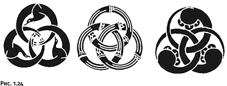 Использование этого символа в Японии относится к XII в., где он обозначал единство трех миров: небесное царство богов, земное царство людей и подземное царство умерших. Три сплетенных кольца можно увидеть в отделке некоторых японских храмов (рис. 1.23).