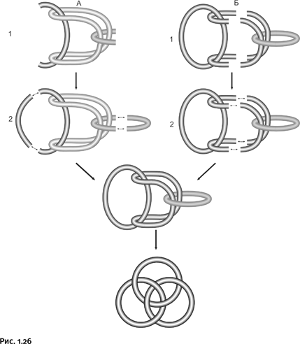 Второй путь (рис. 1.26, схема Б) немного напоминает первый. Следует взять две кольцевые молекулы, расположить их взаимно перпендикулярно и в каждую «продернуть» по две линейные молекулы (стадия Б-1). Осталось соединить попарно «торчащие хвосты» изогнутых молекул (стадия Б-2), и получится нужная нам конструкция.