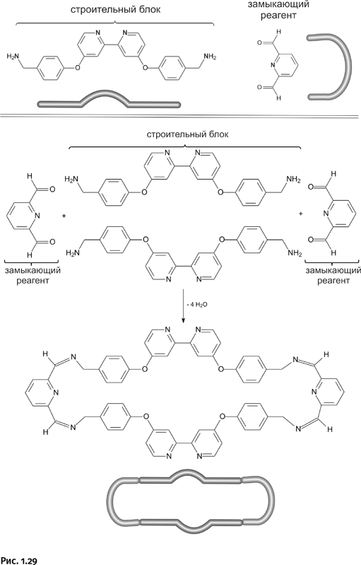 В качестве строительных блоков были взяты удлиненные молекулы, содержащие фрагмент бипиридила в середине молекулы и аминогруппы NH2 на концах. Эти концевые группы нужны для того, чтобы в определенный момент замкнуть с их помощью строительные блоки в циклы. В качестве реагента, замыкающего циклы, была выбрана молекула, содержащая две альдегидные группы – CH=O. Взаимодействие альдегидных групп с аминогруппами – NH2 сопровождается выделением воды и приводит к образованию фрагментов – CH=N–, называемых иминами (рис. 1.28).