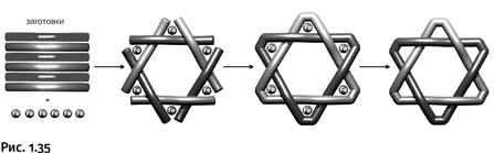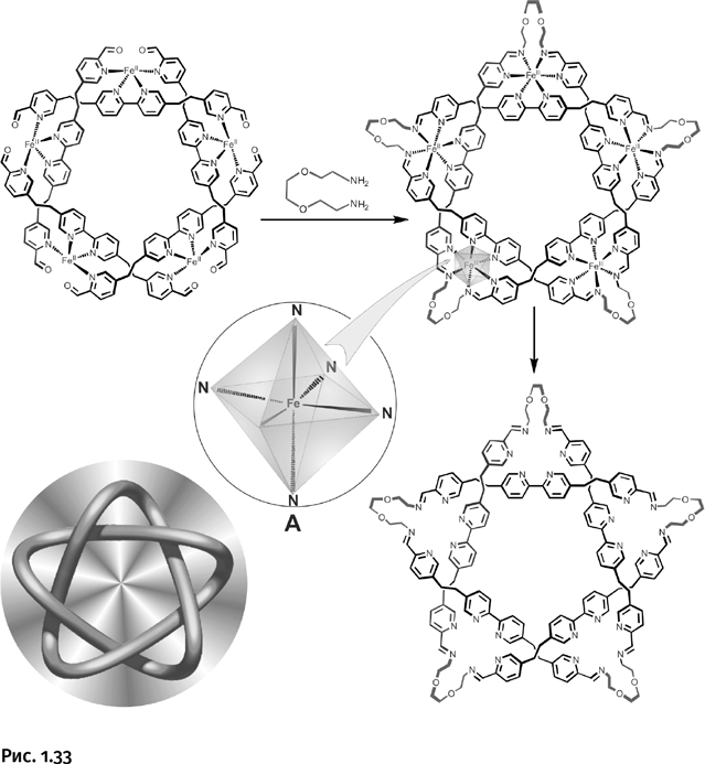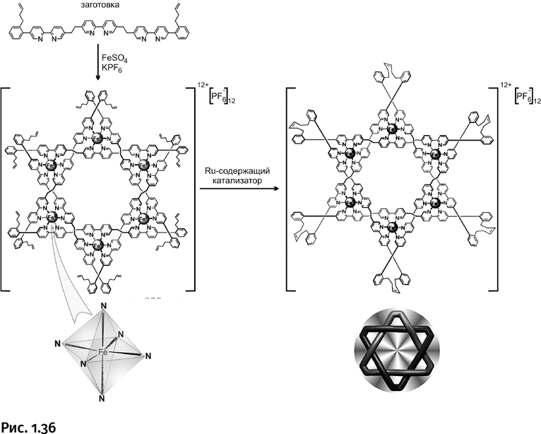 В 2014 г. появилось сообщение о синтезе шестилучевой звезды. В отличие от пятилучевой, это не один цикл, а два, трижды переплетенных друг с другом. Основная идея сборки молекулы та же, что и раньше: «командуют «строительством ионы поливалентного металла – как и в предыдущем случае, это Fe2+. Общая схема включает всего три стадии: ориентированное расположение заготовок в пространстве вокруг ионов железа, соединение хвостов заготовок, в результате два цикла замыкаются и, наконец, удаление ионов железа (рис. 1.35).