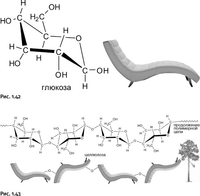 Оказалось, что этот знакомый многим бесцветный порошок со сладким вкусом представляет собой исключительный строительный материал. Если соединить циклы глюкозы в полимерную цепочку, то образуется целлюлоза (от лат. cellula – клетка), из которой сформированы клеточные оболочки растений, фактически каркас, образующий стволы деревьев. Циклы собираются в полимерной цепочке таким образом, что каждый последующий повернут относительно предыдущего «вверх ногами» (рис. 1.43).