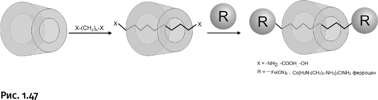 Общая схема такова: молекула углеводорода, содержащая на концах заранее предусмотренные реакционные группы, втягивается внутрь цилиндрического канала, затем торчащие наружу реакционные группы заменяют объемными заглушками (рис. 1.47).