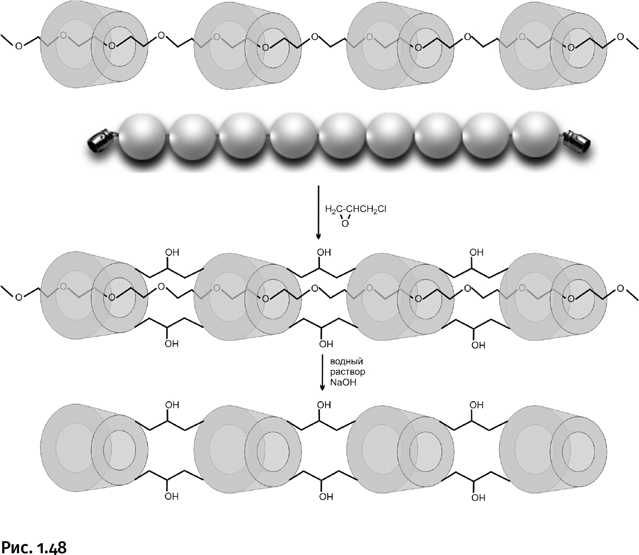 Если молекула, входящая внутрь полого конуса, достаточно длинна, то на нее навешивается несколько конусов и получается конструкция, напоминающая ожерелье. Затем конусы (циклодестрины) соединяют мостиками, а полимер, играющий роль нитки, удаляют. Получается полимерная молекула, представляющая собой полую трубку. На данный момент удалось соединить таким образом 15 молекул циклодекстрина, молекулярная масса полимера 20 000 (рис. 1.48). Такие структуры могут быть использованы для разделения различных веществ.