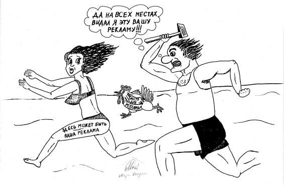 Да и какая человеческая психика выдержит, если ты включаешь телевизор и не можешь даже 10 минут посмотреть любимый фильм или передачу без того, чтобы она не прервалась на показ рекламы, которая еще и сопровождается оглушающе громким, дискомфортным звуком. Человек покупает журнал в 60 страниц, чтобы почитать интересные статьи, а из них 15 полос – это рекламные модули. Человеку за его же деньги насильно показывают то, что он не заказывал! И это не может не приводить его в бешенство.