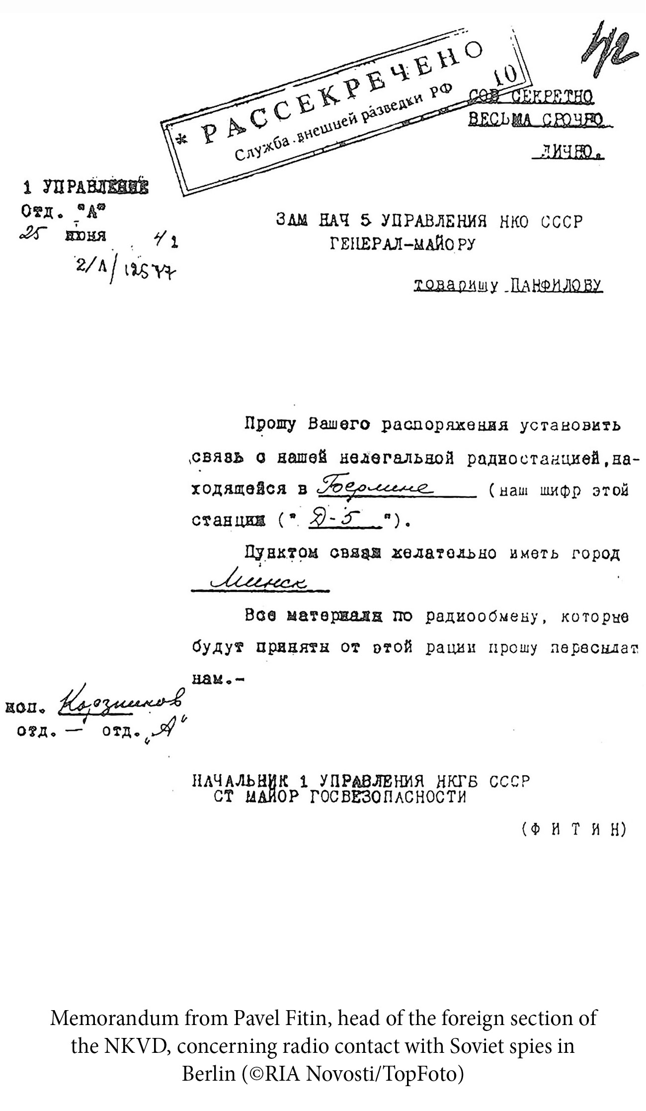 Meanwhile Willy Lehmann’s material also began to include evidence of Germany’s commitment to war with Russia. On 28 May he told his handler that he had been ordered for undisclosed reasons to organise a twenty-four-hour duty roster for his section. A few days later his health collapsed, and he was obliged to take sick leave, from which he returned only on 19 June. What he then learned in his office caused him to discard tradecraft and call an immediate meeting with Zhuravlev, his courier: the Gestapo had been formally informed of an order to initiate military operations against the Soviet Union. This report was immediately forwarded to Moscow, but it seems unlikely that Beria showed it to Stalin until the last hours before the German invasion.