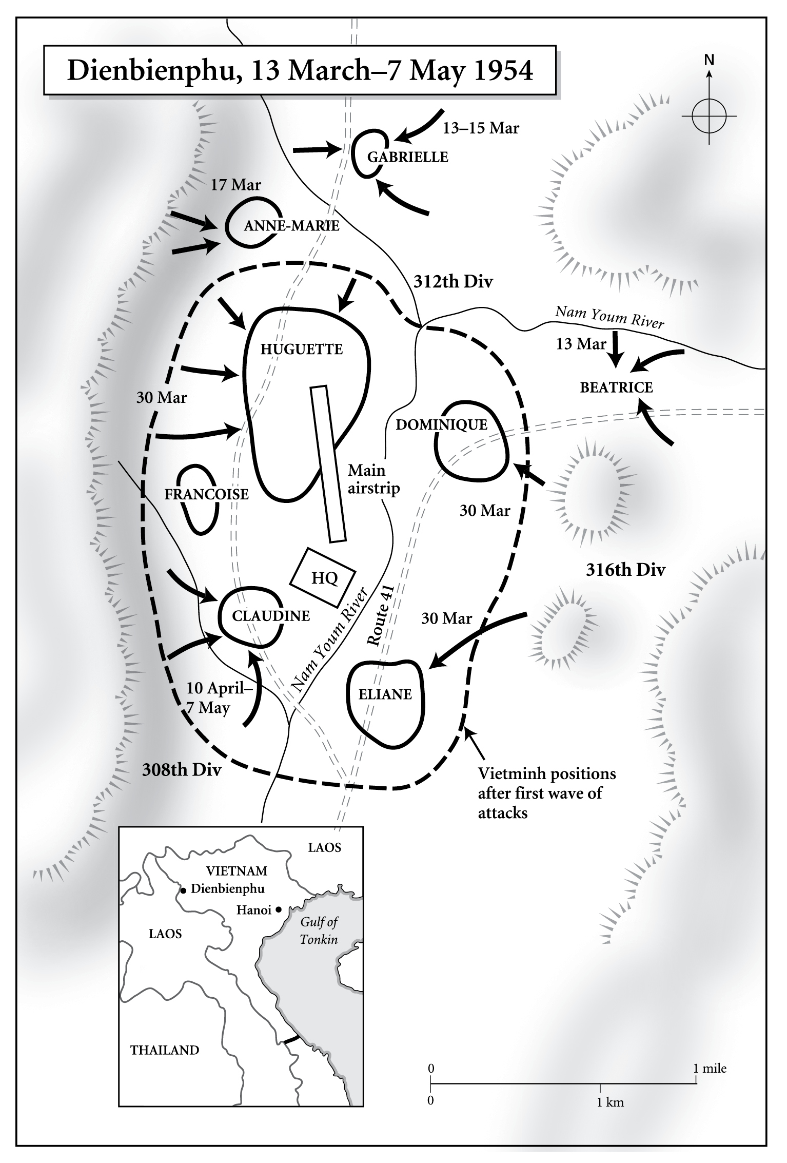 The next two days, 15–16 March, passed almost without incident. Vietminh propaganda loudspeakers broadcast surrender appeals to the defenders in French, Vietnamese, Arabic and German. These were not without effect: Cogny had included in Dienbienphu’s garrison, against de Castries’ strongly-expressed wishes, one Vietnamese and two Thai battalions that were known to be unreliable. French officers had always feared that peace negotiations must precipitate a catastrophic unravelling of their local forces, and so it proved. Following the announcement of the looming Geneva conference, many Vietnamese in French service saw who was winning the struggle for Indochina – and that it was not the colonial power. During the night of 15 March, the first trickle of what swelled into a river of desertions took place from the Thai battalion manning position Anne-Marie, a mile and a half south-west of Gabrielle: one strongpoint was entirely abandoned. Shortly afterwards Vietminh bombardment precipitated a wholesale flight. A French forward observer radioed laconically: ‘The Thais are off.’ Anne-Marie 1 and 2 fell into Giap’s hands almost bloodlessly, and he promptly repositioned there his own mortars and recoilless rifles.