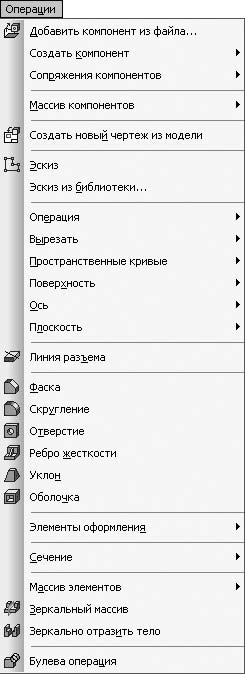 Все остальные команды по назначению идентичны командам меню Операции для документа КОМПАС-Деталь, за исключением того, что операции с массивами предназначены для компонентов сборки, а не для элементов и операций детали.