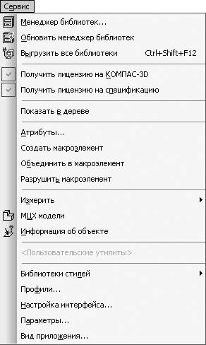Последние четыре команды меню Сервис (Профили, Настройка интерфейса, Параметры и Вид приложения) предназначены для настройки интерфейса и системных параметров программного пакета КОМПАС. Они будут подробно рассмотрены в соответствующем разделе этой главы.
