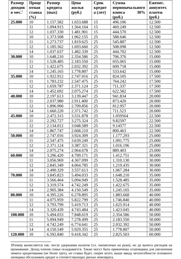 Таблица позволяет по доходу, по цене квартиры, по величине первоначального взноса, по ежемесячному платежу, по размеру кредита определить иные требуемые параметры. Допустим, зная, сколько стоит желанная квартира, можно определить каков требуется доход и первоначальный взнос и как ставка влияет на эти параметры. Обратим внимание, что в таблице указаны максимальные значения2: