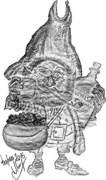 Постепенно оно приняло очертания весьма странного существа, похожего на престарелого карлика в чудном наряде. Карлик отхлебнул из стакана, пыхнул длинной трубкой и огляделся.
