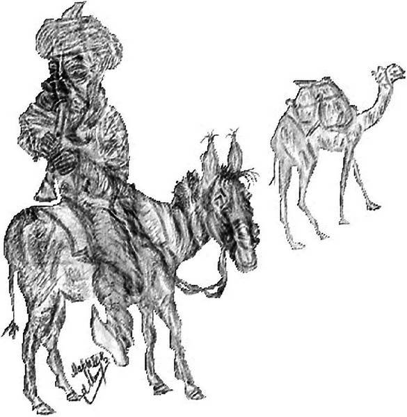 Ведя под уздцы тяжело нагруженного коня, впереди шёл Аль-Фарух. За ним плелся усталый Аль-Мажнун и тянул за собой верблюда.