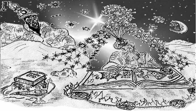 Взобравшись на бархан, Аль-Мажнун оцепенел от увиденного: огненный круг в свете луны и звезд, похожий на небесный шатер, весь светился от пиктограмм и магических знаков. В центре круга сидел Аль-Фарух, а перед ним, словно повисла в воздухе открытая книга с горящими буквами невиданного ранее языка.