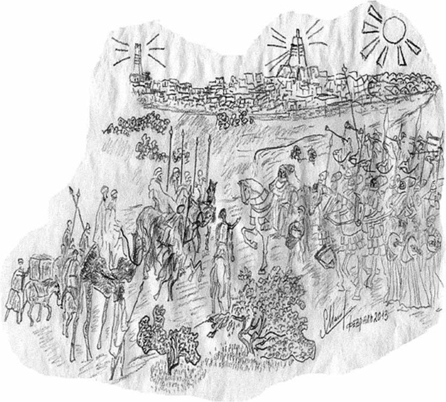 Последние фразы всадника утонули в оглушительном реве труб музыкантов халифа. Процессию сопровождали пешие воины халифа, бесцеремонно вырывавшие деньги, украшения и драгоценности из рук торговцев и горожан. Товар складывали в повозки, к ним же наспех привязывали верблюдов, скот и лошадей.