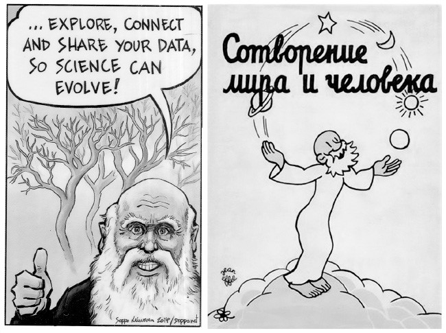 Национальная усыпальница Британской империи, Вестминстерское аббатство в Лондоне, 26 апреля 1882 г. приняло под свои своды тело человека, имя которого вот уже несколько десятилетий гремело по всему просвещенному миру, вызывая полный спектр эмоций – от восторженного почитания до откровенной ненависти и ядовитого сарказма. Человека, который при жизни меньше всего стремился удостоиться такой великой чести и желал бы обрести покой на уединенном сельском кладбище вблизи своего дома, подальше от тысячеглазых толп досужих туристов. Человека, который для многих, очень многих, был и остается образцом гениального исследователя, провидца и революционера в науке. Человека, который раз и навсегда изменил представление человечества о природе, о жизни на Земле и о самом себе. Человека с мудрым усталым взглядом и окладистой седой бородой, портреты которого в старости подозрительно напоминают изображения Бога-Творца, каким его представляли себе поколения европейских художников, от средневековых «богомазов» до французского юмориста Жана Эффеля (см. рис. ниже).