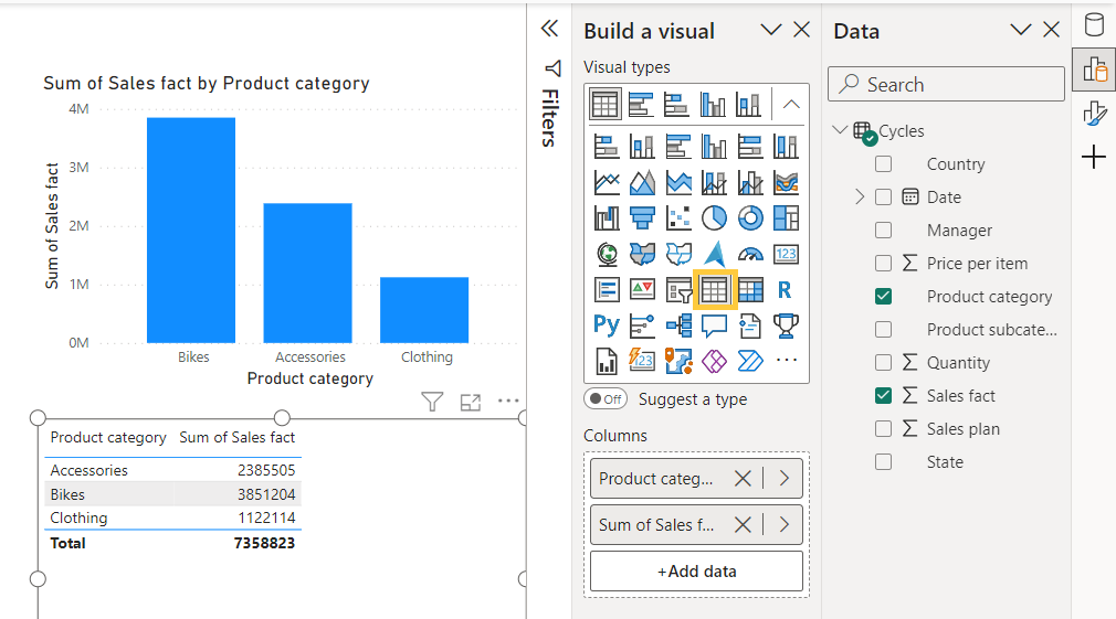 Скопируем нашу диаграмму (Ctrl C–Ctrl V), расположим ниже и изменим тип диаграммы на таблицу. Для этого на панели выбора визуального элемента нужно выбрать иконку таблицы (рисунок 1-14).