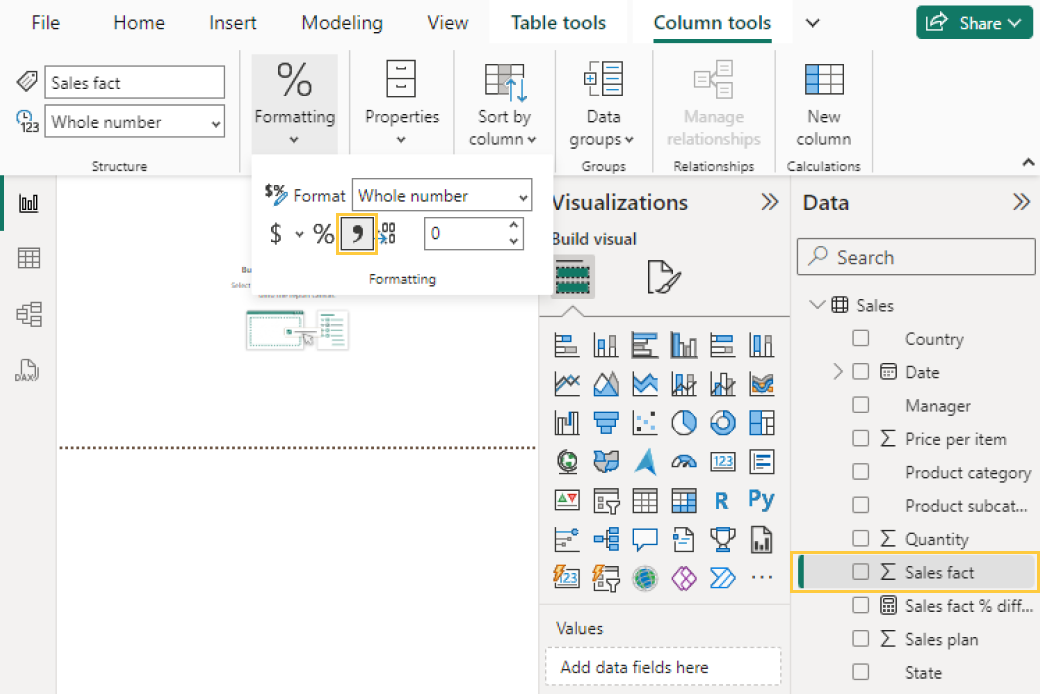 Первым шагом мы должны на панели данных выделить нужное поле (мы будем работать с Продажи факт). Обратите внимание, что мы не кликаем на чекбокс поля, а именно выделяем его путем нажатия на текстовую строку. Верхняя панель меню автоматически переключается на вкладку Средства работы со столбцами (Column tools). Здесь находятся все настройки, связанные с форматом числа. Нас интересует вкладка Форматирование (Formatting), а на ней иконка с запятой. После активирования у иконки появляется граница и заливка (рисунок 1-20). Теперь значение поля Продажи факт на всех визуалах будет отображаться с разделенными разрядами.