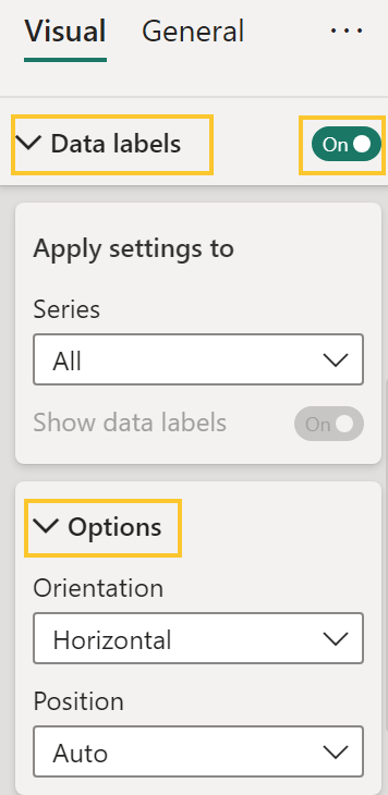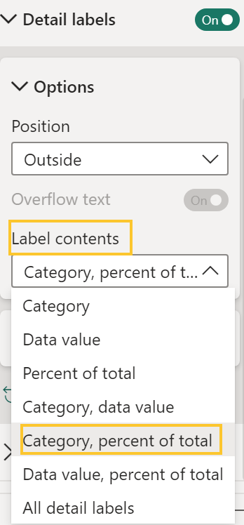 Не удивляйтесь, если вы не увидите пункт Метки данных в опциях визуального форматирования. Здесь он называется Метки подробностей (Detail labels).