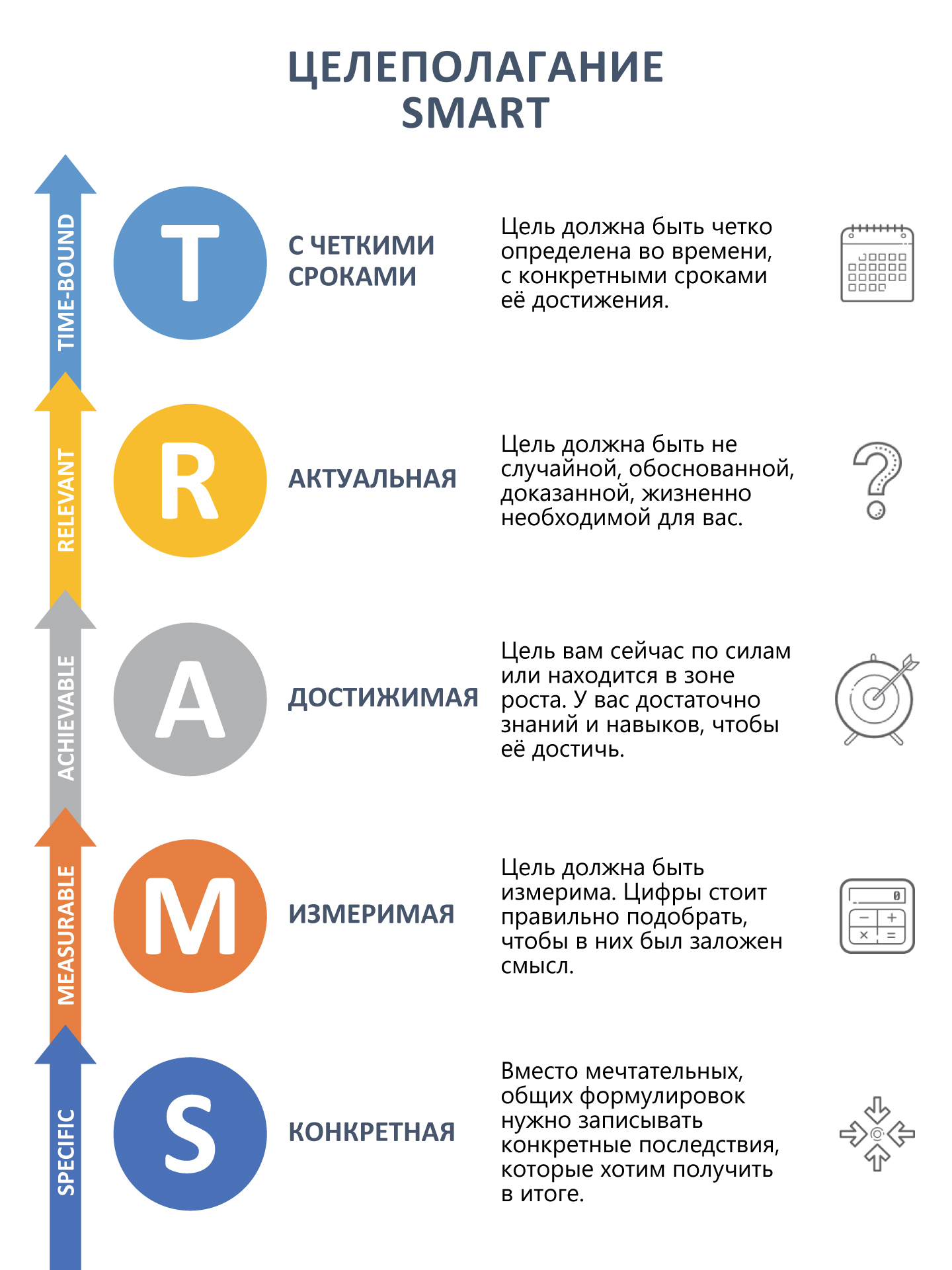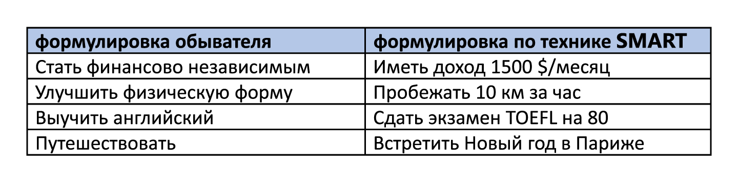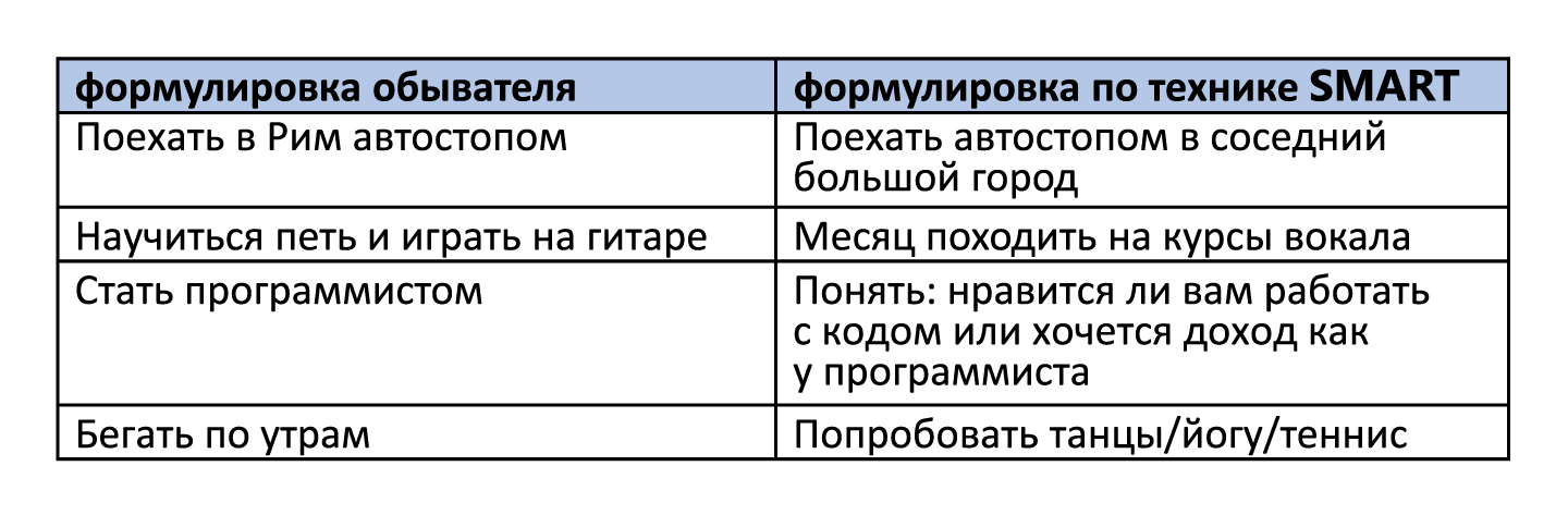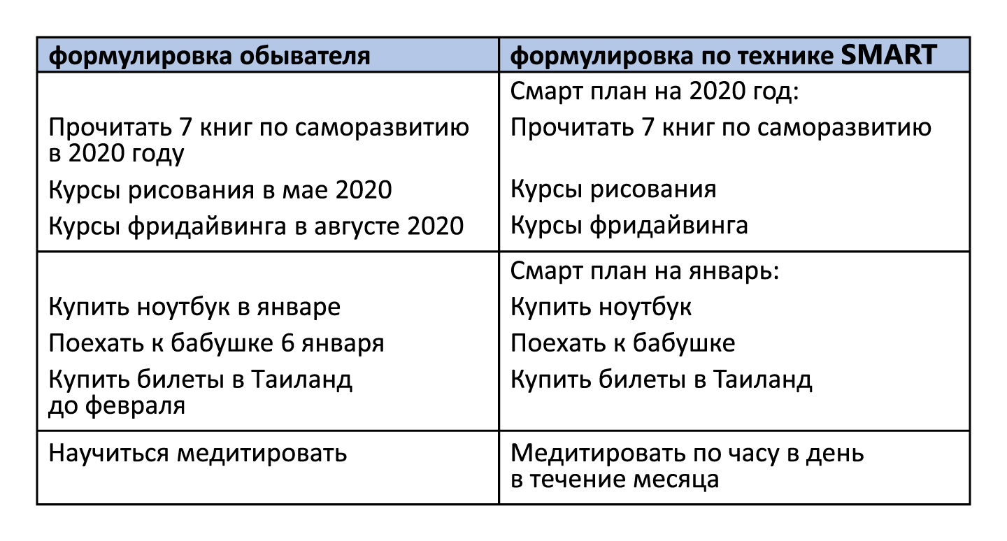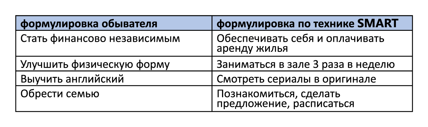 Когда вы уже выбрали долгосрочное направление по жизни, определились со своими базовыми ценностями, можно приступать к среднесрочному и краткосрочному планированию. Тут может помочь техника целеполагания SMART. Но следует помнить, что это просто форма записи ваших целей, а не методика их реализации (реализация зависит от вас).