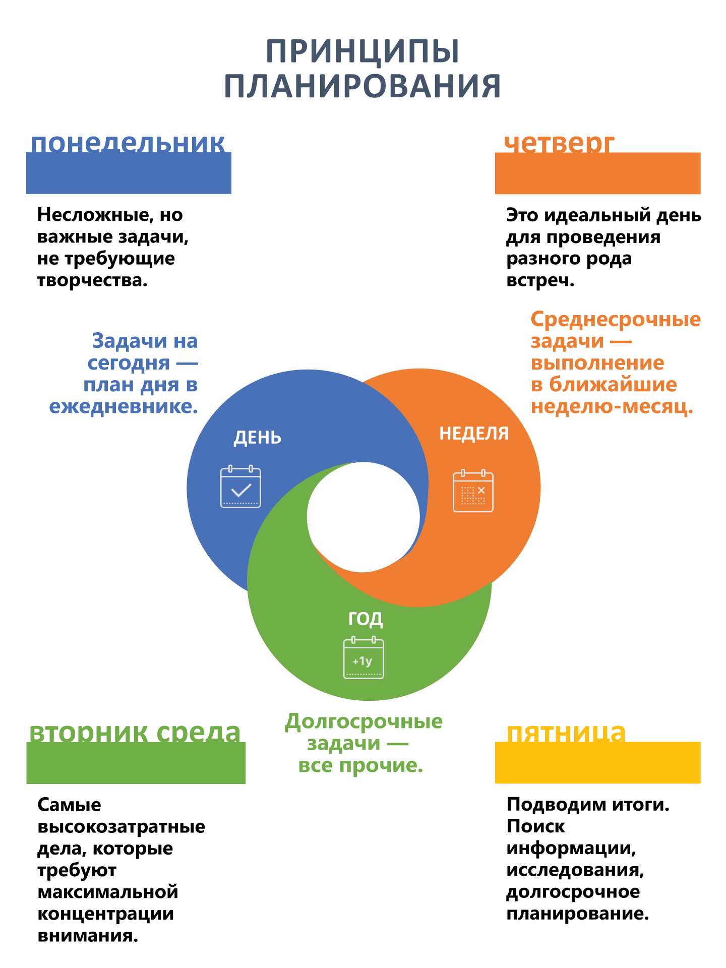 Нужен не жесткий план на период, а жесткие правила перемещения задач между разделами. Вечером, при планировании следующего дня, просматривается раздел «Неделя». Все «дозревшее до выполнения», наиболее актуальное, переносится в раздел «День». Раз в неделю, при планировании следующей недели, просматривается раздел «Год». Все наиболее актуальное переносится в раздел «Неделя». Такая система позволяет не загонять себя в рамки жесткого плана, не пытаться прописывать будущее слишком детально. Кроме того, вы не пускаете все на самотек, гарантируете себе, что нужная задача вспомнится в нужное время за счет регулярного просмотра разделов «Неделя» и «Год». Планируя неделю, нужно помнить, что: