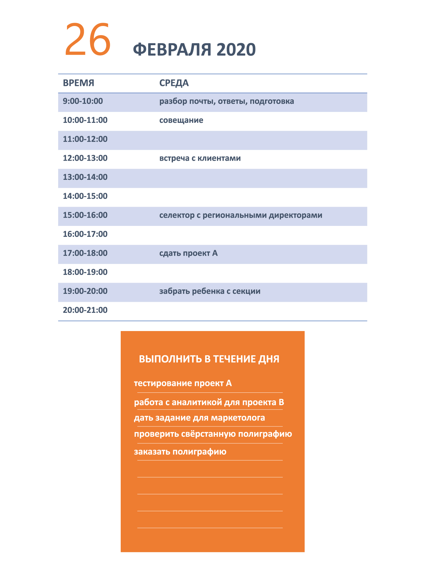 Непреложная истина тайм-менеджмента: план дня должен быть. План существует не для того, чтобы загнать себя в жесткие рамки и не реагировать на изменяющиеся внешние обстоятельства. План – это как раз способ в изменяющихся обстоятельствах ориентироваться.