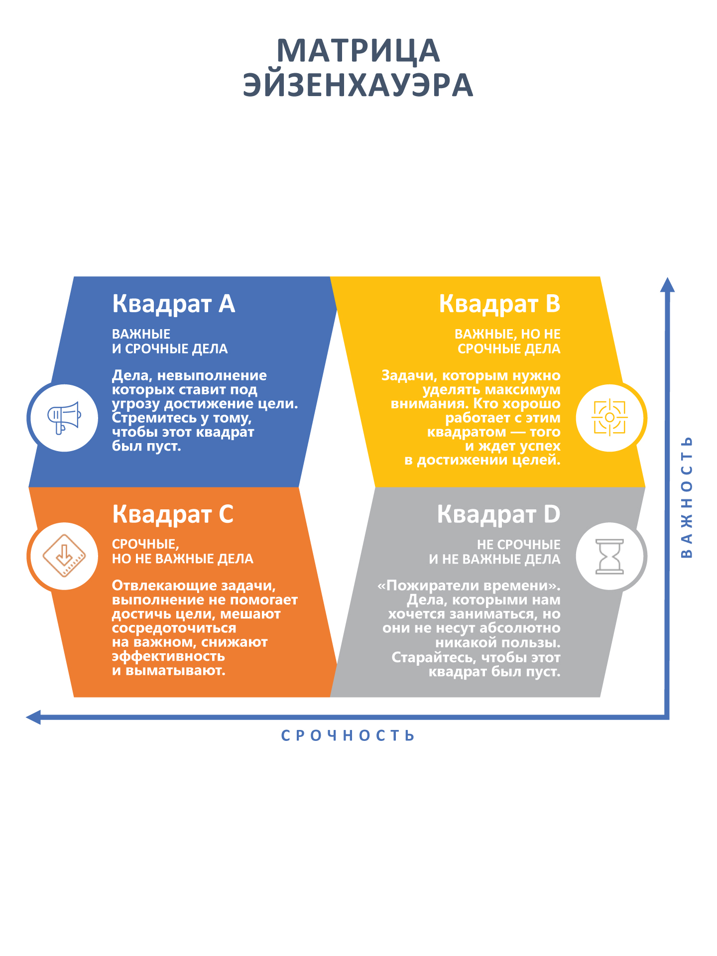 Отвлекающие факторы. Выполнение этих задач не помогает достичь цели, они мешают сосредоточиться на действительно важном, снижают эффективность и выматывают. Есть риск спутать дела из этого сектора с делами квадрата А и получить неразбериху в приоритетах.