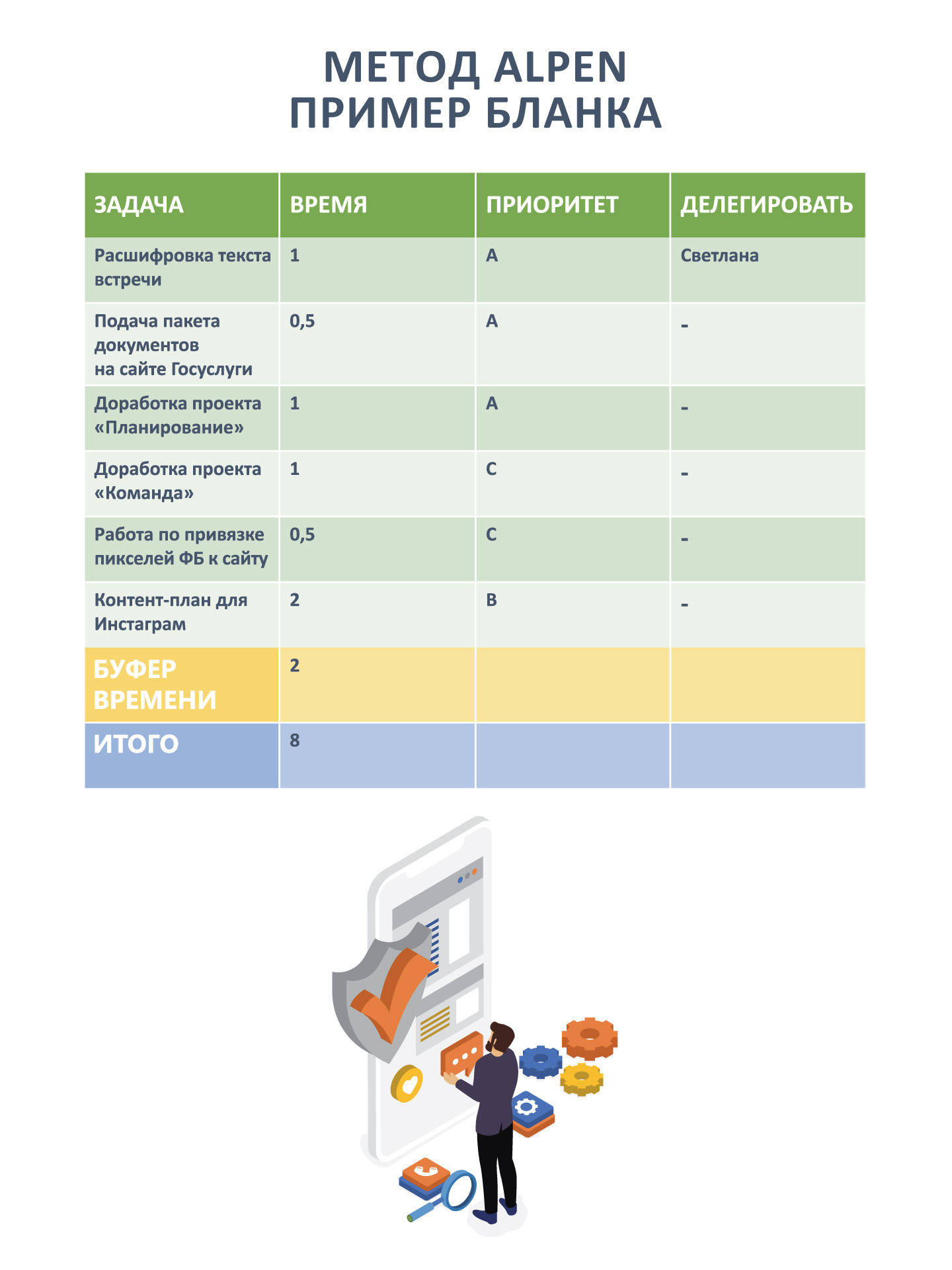 Также обратите внимание, что бывают моменты в течение дня (или недели), когда вас беспокоят очень мало, и моменты, когда телефон постоянно звонит, или приходят посетители. При использовании метода Альпы важно также обращать внимание на самочувствие и свой биоритм.