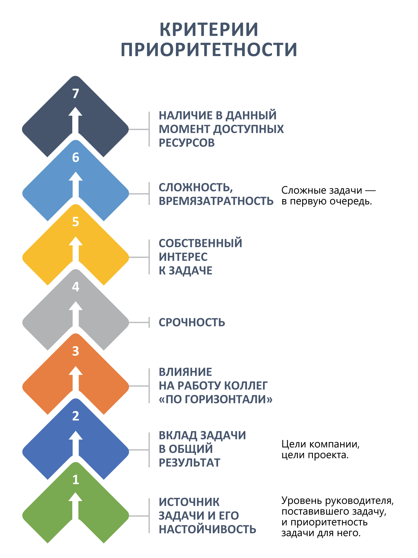 Важно понять, что приоритетность не существует сама по себе. У каждого из нас в голове есть своя система критериев. У разных людей и для разных задач эти критерии и их «весовые коэффициенты» различны. Но можно выделить такие критерии приоритетности: