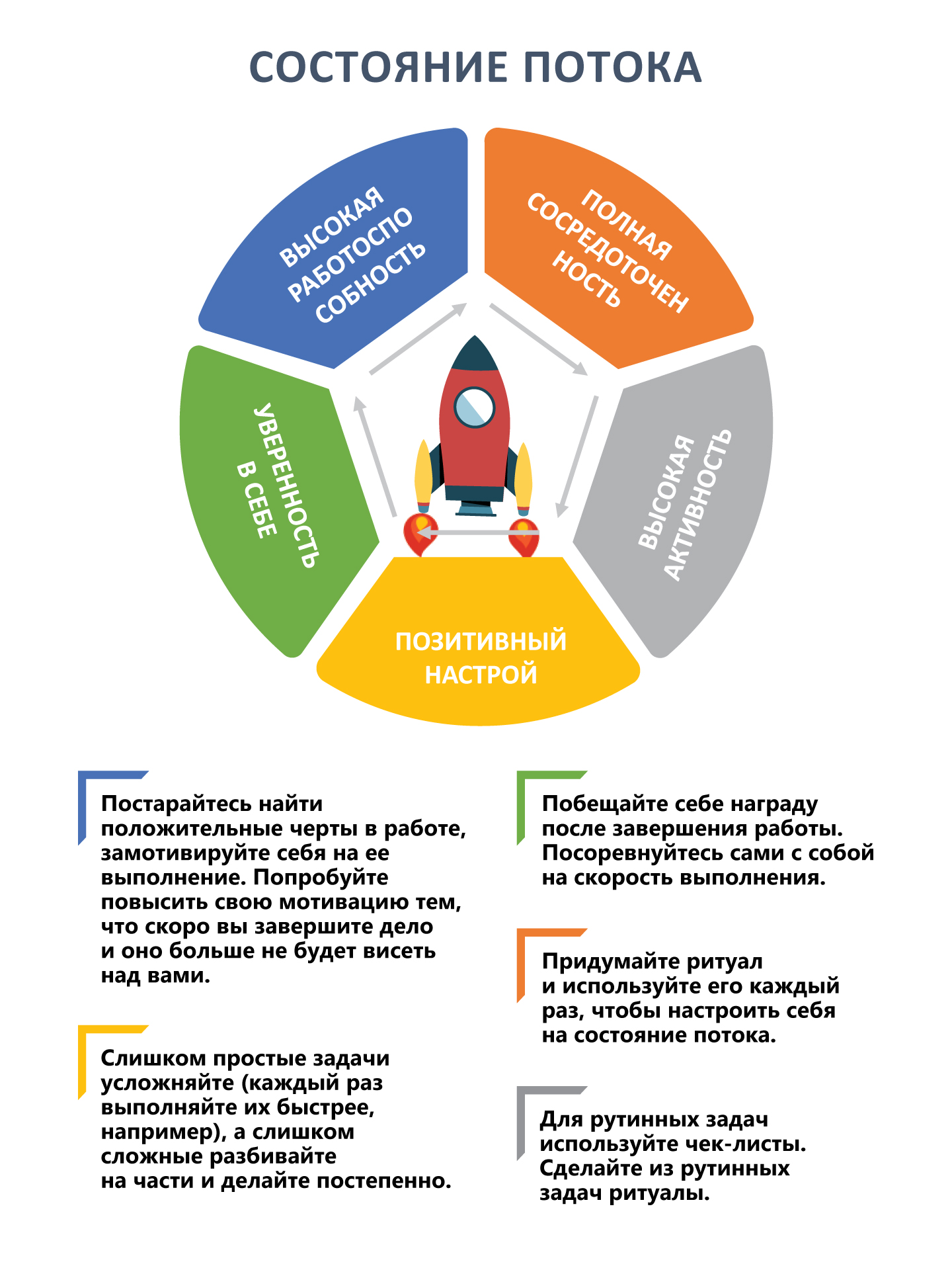 Как включаться в работу, не тратя время на раскачку, не разбирая мелочи и никак не находя в себе сил взяться за главное? В психологии есть хорошее понятие «состояние потока». Предлагаю вам вспомнить ситуацию, когда вы были полностью погружены в какое-либо занятие, не важно, по работе, учебе или чему-либо еще. Речь идет о тех моментах, когда вы глубоко уходили в задачу, ваша работа шла более чем успешно. Наверняка вы когда-либо испытывали подобное состояние и впоследствии радовались полученным результатам – тому, что смогли столько сделать, да еще и за такой короткий промежуток времени. Именно это в психологии и называется состоянием потока. Его главные характеристики – высокая работоспособность, полная сосредоточенность на своей деятельности, высокая активность в рамках текущего занятия. Кроме того, человек в потоке демонстрирует позитивный настой, уверенность в себе и в своих силах. Все это приводит к тому, что мы справляемся даже со сложными задачами, находим необычные способы их решения и в целом демонстрируем необычную эффективность. К сожалению, данное волшебное состояние не всегда приходит тогда, когда мы в нем нуждаемся. Однако можно научиться входить в это состояние и удерживать его.