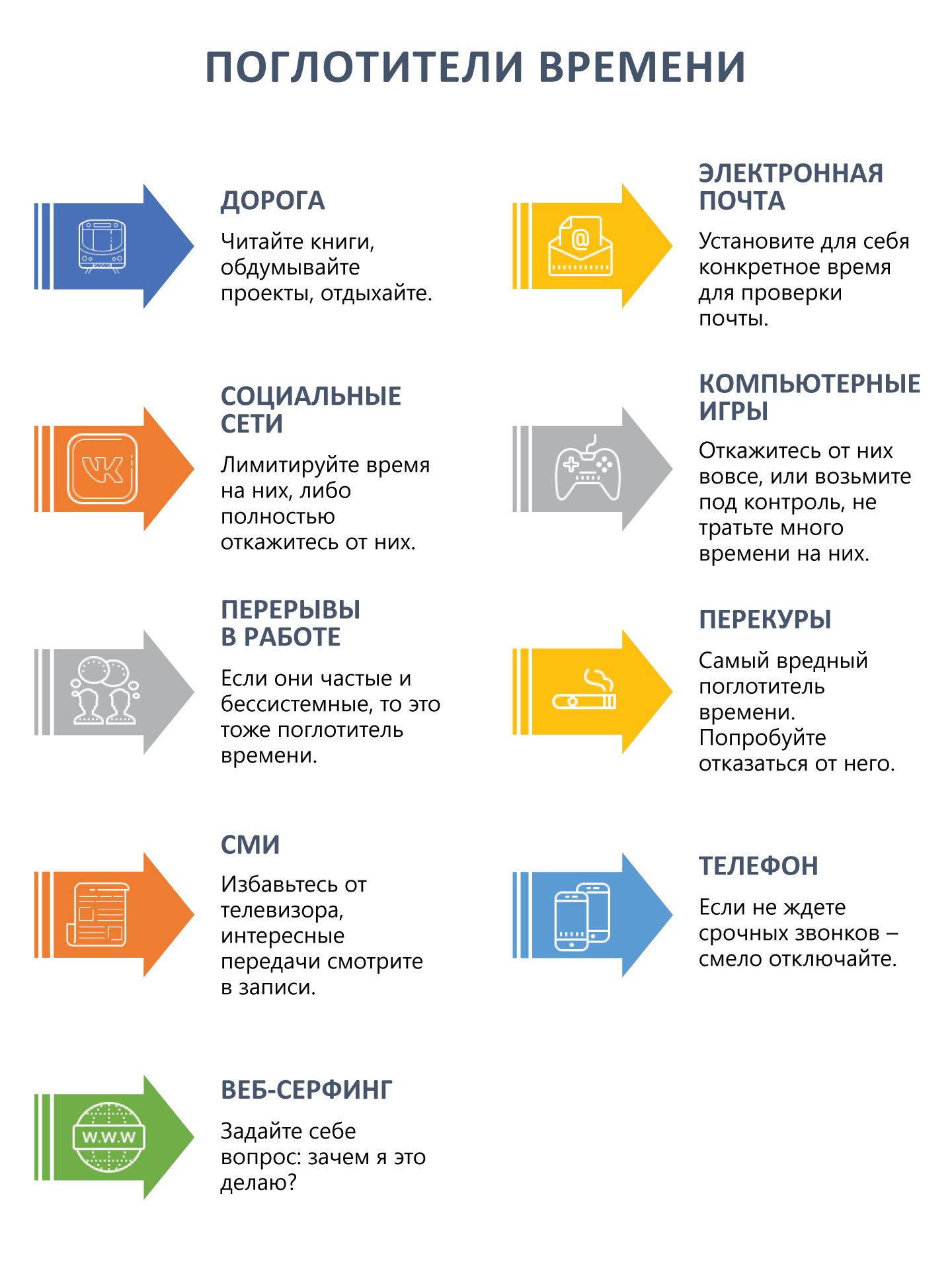 Поглотители времени – это любые факторы, которые приводят к нецелевому использованию времени, они съедают не только ваше время, но и ваши силы, возможности и цели. Важно не только обнаружить поглотители времени, но и активно им противостоять.