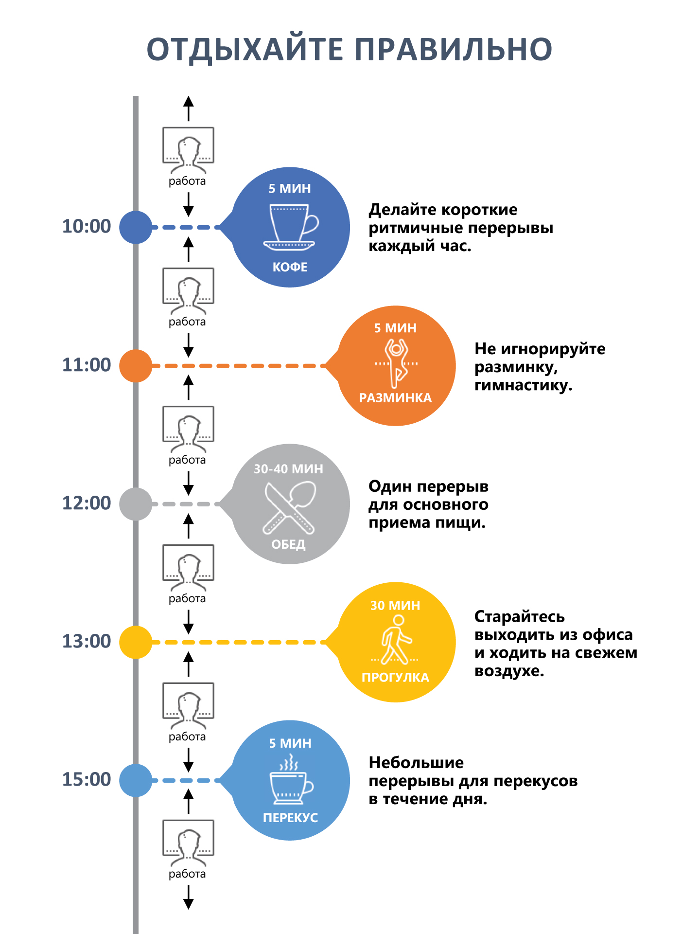 Многие сегодня считают, что успех возможен, только если вы все время заняты. Если у вас есть время для небольшой прогулки, значит, у вас недостаточно драйва и амбиций. Но на самом деле ваши запасы энергии ограничены, и только частые короткие перерывы помогают действительно отдохнуть и затем реализовать свой потенциал. И последнее: некоторые думают, что можно весь день работать, не отрываясь, а потом полностью отключаться. Это подойдет роботу, но человеку – вряд ли. Сильное утомление в конце рабочего дня сильно осложняет отдых в нерабочие часы. Иными словами, если вы позволяете себе перерывы, то отдых в нерабочее время будет более эффективным и подстегнет вашу производительность и креативность на следующий день.